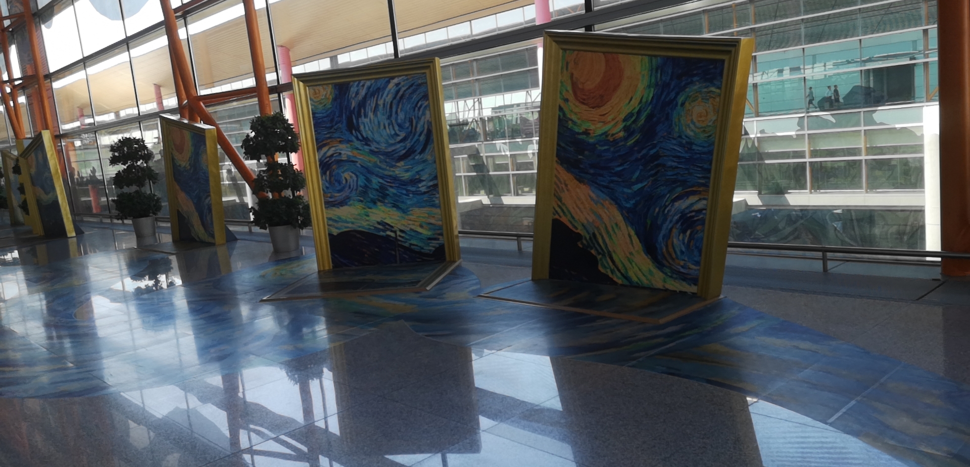 星空長廊以星空為主題,玻璃幕墻上有高為5.2米的星月夜圖案,沿途地面鋪設(shè)星月夜地貼,設(shè)置了六處動物造型綠植,有兔子、小熊、大象、麋鹿等動物造型,共計70米長。