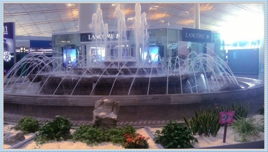 T3E免稅區(qū)的中央景觀設(shè)計(jì)了《御泉垂虹》噴泉。它的造型借鑒了萬園之園的圓明園“大水法”,它豐富多彩的噴水形式和色彩把航站樓2公里的軸線裝點(diǎn)得色彩斑斕。在水池的東(青龍)、南(朱雀)、西(白虎)、北(玄武)有四個(gè)震水獸,保四方風(fēng)調(diào)雨順、九洲平安。