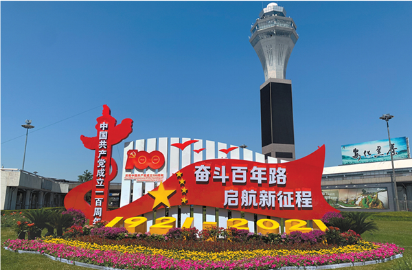 在亮相T2樓前的《奮斗百年路啟航新征程》主題景觀中,五顏六色的鮮花與郁郁蔥蔥的草坪交相輝映,紅旗高高飄揚(yáng),熠熠生輝,象征建黨百年的偉大成就以及紅色革命精神的傳承,生動(dòng)展現(xiàn)了中國(guó)共產(chǎn)黨團(tuán)結(jié)帶領(lǐng)中國(guó)人民不忘初心、牢記使命、艱苦奮斗的百年光輝歷程。