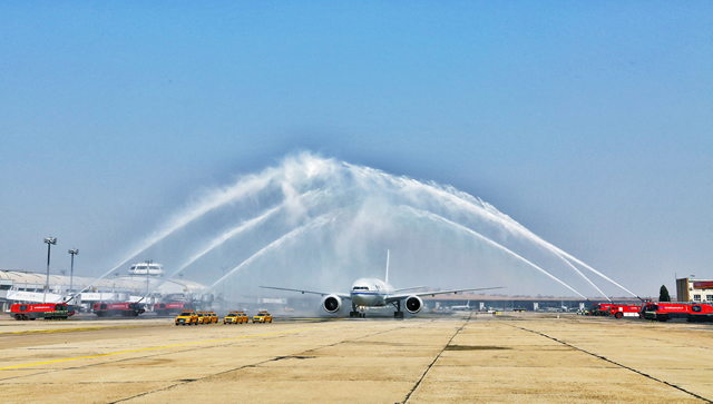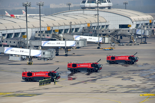 壯觀絢麗的三道水門看似并不復雜,卻絕非“大力出奇跡”的簡單操作。參保人員先后數(shù)十次利用747實體訓練飛機開展訓練,從車輛點位確定到射水時間把控,從依據(jù)風向調(diào)整水炮方向到兩車進行水流對接,每一個細節(jié)都需要反復琢磨。同時,為使水門能夠保持較長的時間,保障組人員精密測算,確定了現(xiàn)場車輛距離條件下形成水門的最小射流,既能保證水門的完美形態(tài),又能將時間控制地精準。